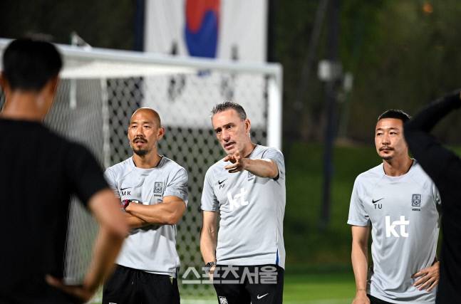 축구대표팀 벤투 감독이 25일 카타르 도하 에글라 트레이닝센터에서 훈련 지시를 하고 있다.