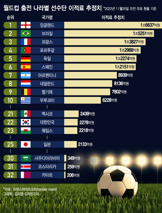 [더차트]"몸값만 1.6조" 월드컵 선수단 1위는…韓 2278억 '22위'