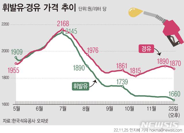 ![[서울=뉴시스] 김진아 기자 = 전국 주유소의 휘발유 판매 가격이 소폭 내리고 경유 가격은 오른 것으로 나타났다. 19일 한국석유공사 유가정보시스템 오피넷에 따르면 11월 셋째 주 전국 주유소 휘발유 평균 판매 가격은 전주보다 0.9원 내린 1658.7원으로 10주 연속 하락했다. 6주째 상승세를 이어가고 있는 경유 판매 가격은 전주 대비 4.3원 오른 1888.8원이다. 사진은 20일 서울의 한 주유소. 2022.11.20. bluesoda@newsis.com](https://img4.daumcdn.net/thumb/R658x0.q70/?fname=https://t1.daumcdn.net/news/202211/26/newsis/20221126070014100nfxa.jpg)