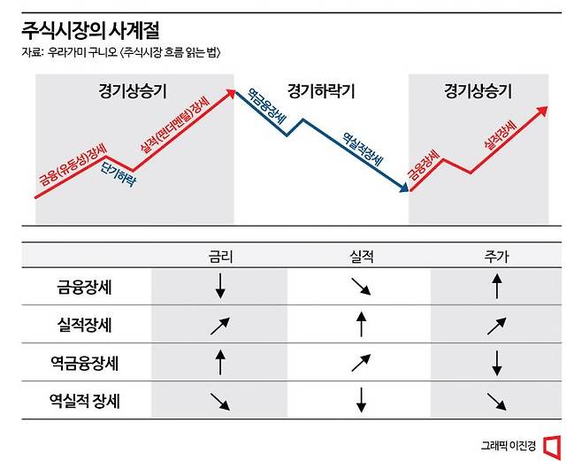 실적마저 나빠지며 주가가 바닥으로 곤두박질치는 '역실적장세', 이렇게 4개 국면으로 주식시장을 정의했습니다.