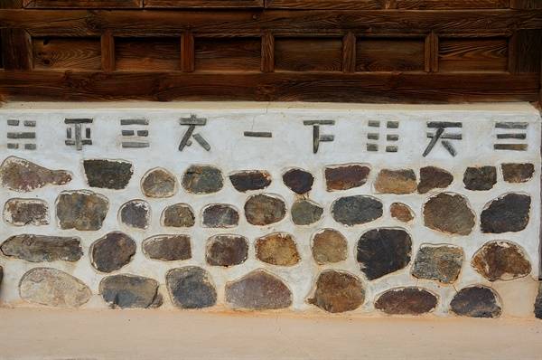 | ▲ 천하태평 꽃담 베풂을 전통으로 여기는 집안답게 온 세상이 태평하기를 바라는 마음을 담았다. 이집안의 의지를 온 세상에 알리려는 듯 대문에서 제일 잘 보이는 사랑채벽체 정면에 새겼다. |