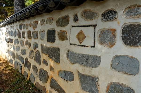 | ▲ 담장꽃담 안채후원 뒷담에 뒷동산으로 통하는 협문이 있다. 협문 양쪽에 국화문에 쌍희자를 새긴 꽃담이 있다. |