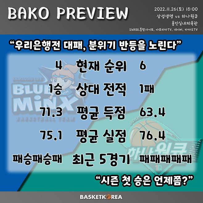 [BAKO PREVIEW] 2022.11.26 삼성생명 vs 하나원큐