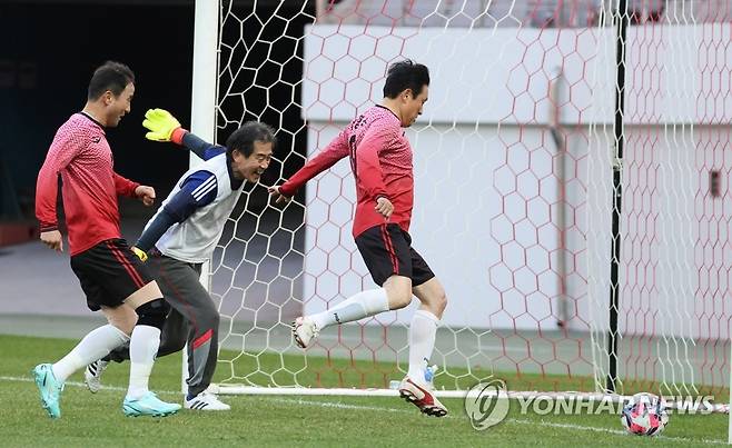 (서울=연합뉴스) 이정훈 기자 = 26일 오후 서울월드컵경기장에서 열린 2002년 한일월드컵 개최 20주년 기념 한·일 국회의원 축구대회에서 국민의힘 박형수 의원이 골을 넣고 있다. 2022.11.26