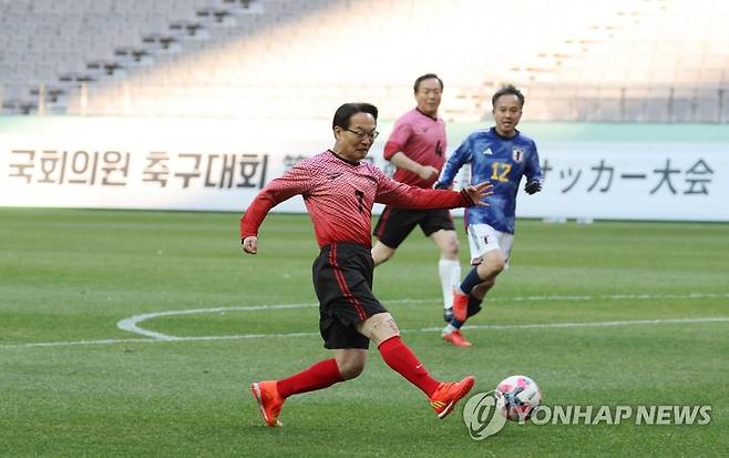 (서울=연합뉴스) 이정훈 기자 = 26일 오후 서울월드컵경기장에서 열린 2002년 한일월드컵 개최 20주년 기념 한·일 국회의원 축구대회에서 국민의힘 조해진 의원이 슈팅하고 있다. 2022.11.26