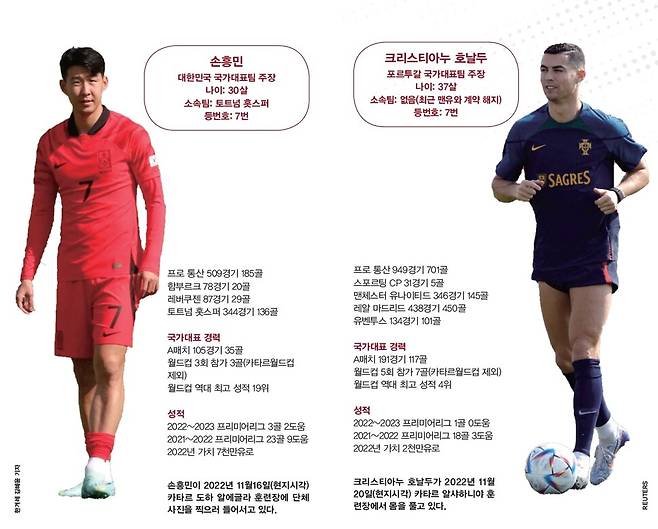 국제축구연맹(FIFA)은 카타르월드컵 개막에 앞서 등번호 ‘7번’을 달고 월드컵을 빛낸 전·현직 선수 10명을 소개했다. 이번 월드컵 본선에 ‘7번’을 달고 참가하는 현역 선수는 4명이 포함됐다. 이 중 손흥민과 호날두가 있다. 한국과 포르투갈의 ‘7번’이자 양 팀의 주장이 2022년 12월3일(한국시각) 0시 카타르 도하에서 맞붙는다. 월드컵 H조 마지막 경기다.