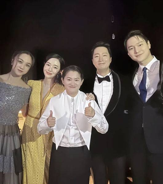 이정현은 '헤어질 결심'의 주연 배우인 박해일과 탕웨이, 그리고 감초 연기를 선보인 고경표와 김신영과 함께 사진을 찍었다.