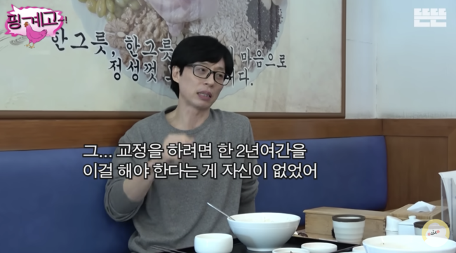 유재석은 “교정을 하려면 한 2년 여를 해야 해서 자신이 없었다. 아플 것 같고 그래서 안했다”고 밝혔다. 그러면서 “내가 이걸 한다고 해서 (외모가) 달라지지 않을 거라고 그 당시에는 확신이 들었다"고 덧붙였다. 그러자 송은이는 “참 애가 현명했다”라고 대꾸해 폭소케 했다.