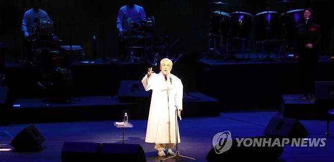 (인천=연합뉴스) 손현규 기자 = 26일 오후 인천문화예술회관 대공연장에서 소리꾼 장사익(73)이 열창하고 있다.