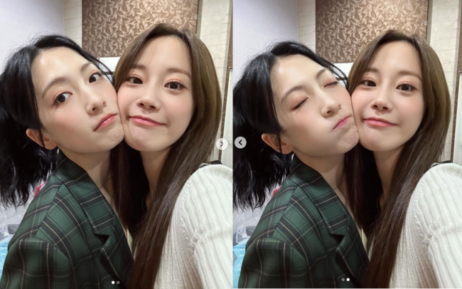 공유한 사진 속 강지영(왼쪽)과 허영지(오른쪽)은 서로 볼을 맞대고 다정한 모습을 선보였다.