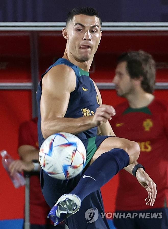 (도하=연합뉴스) 임헌정 기자 = 2022 카타르 월드컵 한국의 조별리그 3차전 상대인 포르투갈 축구 대표팀의 크리스티아누 호날두가 26일 오후(한국시간) 카타르 도하 외곽의 알샤하니야 SC 훈련장에서 훈련하고 있다. 2022.11.26