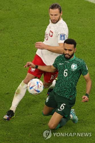 epa10330050 Grzegorz Krychowiak (L) of Poland in action against Mohammed Alburayk of Saudi Arabia during the FIFA World Cup 2022 group C soccer match between Poland and Saudi Arabia at Education City Stadium in Doha, Qatar, 26 November 2022. EPA/Friedemann Vogel