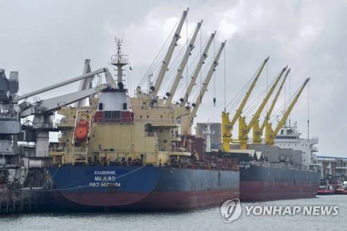 The Eaubonne bulk carrier ship docks in the port of Mombasa, Kenya Saturday, Nov. 26, 2022. The vessel arrived with 53,300 tons of wheat for commercial use in Kenya and procured under the Black Sea Grain Initiative, a deal to ease the export of Ukrainian grain and foodstuffs through the Black Sea, according to the honorary consulate of Ukraine in Mombasa. (AP Photo/Gideon Maundu)