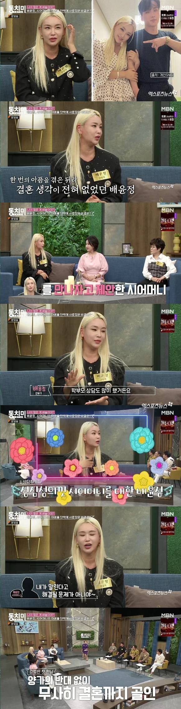 26일 방송한 MBN '속풀이쇼 동치미'에서 배윤정은 '나이 차이 때문에 결혼 반대를 겪었냐'라는 질문에 "있었다"라고 답했다.