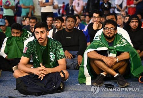 epa10330084 Fans of Saudi Arabia watch the group C match between Poland and Saudi Arabia in stadium fan zone of Stadium 947 which will host the FIFA World Cup 2022 group D match between France and Denmark, Doha, Qatar, 26 November 2022. EPA/Noushad Thekkayil