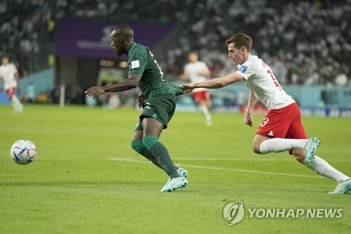 Saudi Arabia's Saud Abdulhamid is pulled by Poland's Jakub Kaminski during the World Cup group C soccer match between Poland and Saudi Arabia, at the Education City Stadium in Al Rayyan, Qatar, Saturday, Nov. 26, 2022. (AP Photo/Aijaz Rahi)