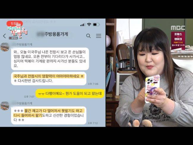 이국주는 주방용품 기구 업체 사장님과 긴밀하게 메신저를 주고받는다고. 이국주는 “원래 업소용 칸은 구석에 있었다. 그런데 거기로 가는 데가 더 간다. 그리고 분식용 그릇 노란색을 제가 산 걸 보고 원래 안 팔리던 색인데 잘 팔린다더라”라며 자랑했다.