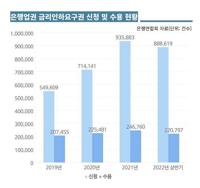 또 최승재 국민의힘 의원은 차주에게 금리인하요구권을 정기적으로 고지하도록 하는 법안을 냈으나, 이미 은행업계가 자율적으로 연 2회 고지하고 있어 실효성이 크지 않다는 지적이 나왔다.