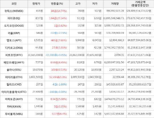또한, 위믹스(14.74%, 654원), 메인프레임(8.45%, 7.57원), 앱토스(7.66%, 6,535원), 무비블록(6.4%, 3.66원), 디카르고(5.91%, 44.8원), 아하토큰(5.08%, 7.03원), 이더리움(1.0%, 1,661,500원), 도지코인(0.82%, 123원), 솔라나(0.53%, 19,070원), 카바(0.35%, 1,445원)가 상승세를 나타냈다.
