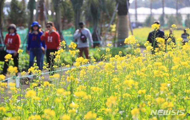[서귀포=뉴시스] 우장호 기자 = 전국적으로 기온이 큰 폭으로 떨어진 27일 오전 제주 서귀포시 남원읍 휴애리 농장에 봄꽃인 노란 유채꽃이 활짝 피어나 이색 정취를 자아내고 있다. 기상청에 따르면 오는 28일 제주도를 시작으로 전국에 비가 내린 후 수은주가 영하권 아래로 내려가는 큰 추위가 찾아올 전망이다. 2022.11.27. woo1223@newsis.com