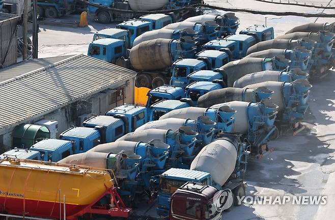 (서울=연합뉴스) 박동주 기자 = 화물연대 총파업 나흘째인 27일 서울의 한 레미콘 공장에 세워져 있는 레미콘 차량의 모습. 레미콘 업계 관계자들은 다음주 화요일(29일)부터 전국적으로 레미콘 생산이 멈출 것으로 전망했다. 2022.11.27