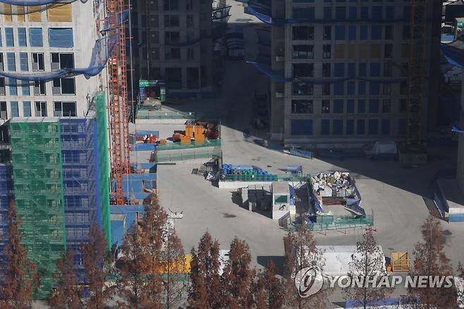 (서울=연합뉴스) 박동주 기자 = 화물연대 총파업 나흘째인 27일 레미콘 타설이 중단된 서울 강동구 둔촌주공아파트 재건축 현장의 모습. 2022.11.27