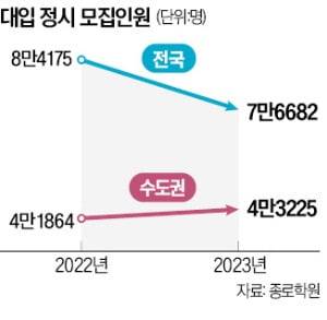 27일 입시업계에 따르면 2023학년도 전국 4년제 대학 정시 최초 모집인원은 7만6682명으로 전체(34만9124명)의 22.0%를 차지한다. 전년도 8만4175명과 비교해 7493명 줄었다. 하지만 수도권 대학은 4만3225명으로 전년 대비 1361명 늘었다. 이는 서울대 연세대 고려대 등 주요 대학에서 수능 중심의 정시모집 비율을 40% 이상으로 높였기 때문이다.
