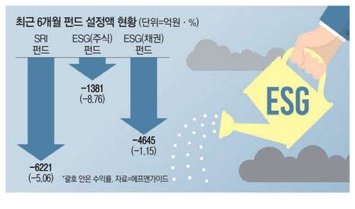 ESG(환경·책임·투명경영)를 내세운 펀드가 저조한 수익률을 이어가면서 최근 6개월간 관련 펀드에서 1조원이 넘는 자금이 빠져나갔다.