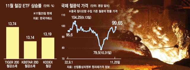 철강 ETF가 반등한 데에는 침체된 중국 부동산 경기가 활력을 되찾으면서 철강 수요가 늘어날 것이라는 기대감이 작용한 것으로 풀이된다. 앞서 11일 중국 중앙은행인 인민은행과 은행보험감독관리위원회(은보감회)는 부동산 개발기업들의 은행 대출 상환 기한을 기존 6개월에서 1년으로 연장하고, 채권에 대한 상환 기간도 연장되거나 협상으로 바꿀 수 있도록 했다. 25일에는 지급준비율(지준율)도 낮춰 시중에 5000억 위안(약 93조 원) 규모의 장기 유동성을 공급하겠다는 계획도 밝혔다. 신승웅 신한투자증권 연구원은 "제20차 전국대표대회(당 대회) 이후 부동산 지원 정책이 강화되면서 경기 연착륙을 위한 우호적 여건이 형성되고 있다"며 "중국 정부의 적극적인 부동산 안정화 정책 의지에 부동산 경기의 선행지표 역할을 하는 철광석 가격 역시 이달 큰 폭으로 상승했다"고 말했다.