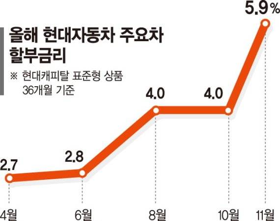 현대차그룹의 전속 금융사인 현대캐피탈의 자동차 할부상품 금리도 현대차 투싼, 싼타페, 아반떼 등 인기 차종은 올해 4월 2.7%에서 이달에 5.9%(36개월 기준)까지 상승했다. 7개월 사이 금리가 2배 넘게 올랐다. 특히 60개월 기준으로는 6.1% 금리가 적용돼 6%대를 넘어섰다. 차량 가격이 더 고가인 제네시스는 36개월 기준 할부금리가 6.7%까지 치솟았다. 120개월로 기간을 늘리면 8.2% 금리가 적용된다.