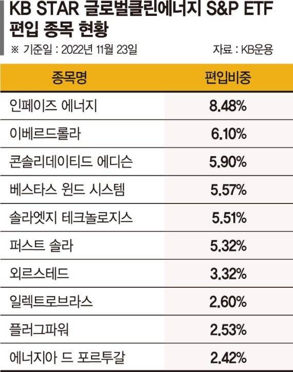 펀드 운용역인 차동호 ETF솔루션운용본부장은 "글로벌 증시에 상장된 주식 가운데 태양광·풍력·수소·전기차 등 광범위한 친환경 에너지 관련기업에 투자한다"며 "시가총액, 유동성, 산업 관련도 등을 고려해 선별된 주식에 투자하고 있다. 국가별 넘버원 친환경 에너지기업 위주로 구성돼 있다"고 설명했다.
