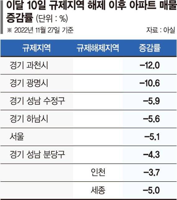 다만, 인천·세종은 낙폭도 지속되고 매물 감소 역시 적어 정책효과가 나타나지 않고 있다. 한국부동산원에 따르면 10월 월간 아파트 매매가격지수는 인천·세종이 각각 -1.94%, -1.76%를 기록해 통계 작성 이래 최대 낙폭을 경신했다. 규제해제 발표 이후 두 지역의 매물 감소율(10~27일 기준)은 인천 3.7%(2만7054→2만6051건), 세종 5%(5081→4827건)로 규제지역으로 남은 과천·광명에 미치지 못한다. 이외에도 규제지역인 하남의 감소율이 5.6%(2686→2535건), 성남 수정구는 5.9%(958→901건), 서울은 5.1%(5만7370→5만4443건)로 높게 나타났다. 규제지역 중 성남 분당구만 매물 감소폭 4.3%(3499→3350건)로 인천보다 높고 세종보다 낮은 수치를 보였다.