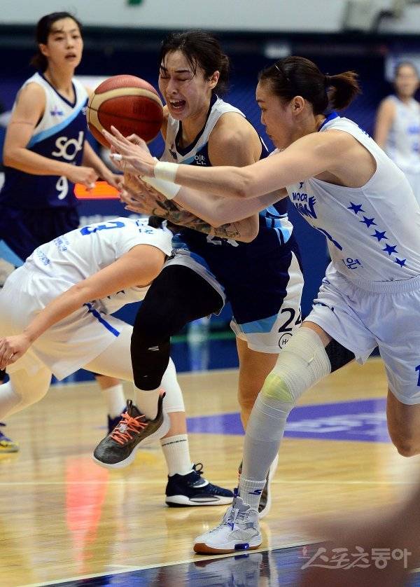 27일 인천 도원체육관에서 열린 ‘신한은행 SOL 2022-2022 여자프로농구’ 인천 신한은행과 아산 우리은행의 경기에서 신한은행 김소니아가 우리은행 수비 사이로 돌파하고 있다.