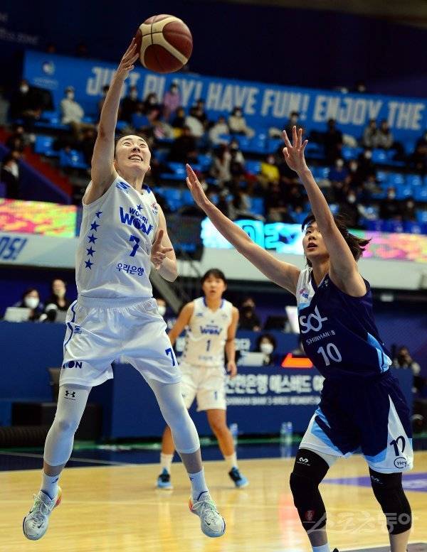 27일 인천 도원체육관에서 열린 ‘신한은행 SOL 2022-2022 여자프로농구’ 인천 신한은행과 아산 우리은행의 경기에서 우리은행 박혜진이 신한은행 수비를 피해 슛을 쏘고 있다.