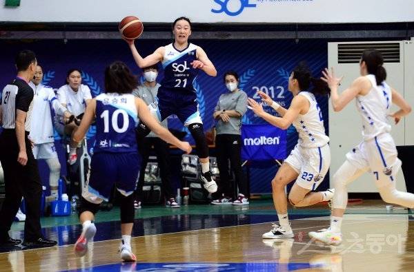 27일 인천 도원체육관에서 열린 ‘신한은행 SOL 2022-2022 여자프로농구’ 인천 신한은행과 아산 우리은행의 경기에서 신한은행 김진영이 패스하고 있다.