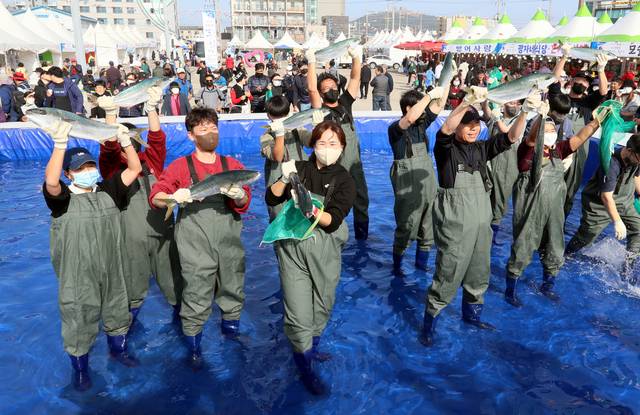 제주도 서귀포시 대정읍 모슬포항 일대에서 27일 열린 제22회 최남단 방어축제에서 참가자들이 맨손으로 잡은 방어를 들어올리고 있다. 최남단 방어축제는 다음 달 25일까지 이어진다. 연합뉴스