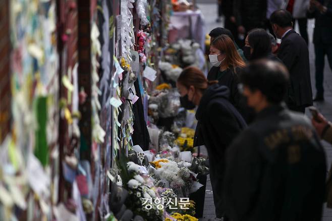 ‘이태원 핼러윈 참사’ 발생 한 달을 하루 앞둔 27일 서울 용산구 이태원 참사 현장에 마련된 추모 공간에서 시민들이 희생자들을 애도하고 있다. 참사가 발생한 지 한 달이 되었지만 진상 규명과 책임자 처벌은 이뤄지지 않고 있다.