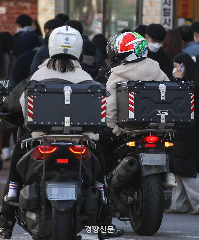 서울 동대문구 한국외국어대학교에서 27일 2023학년도 수시모집 논술고사를 치른 학생들이 다른 대학 논술고사에 응시하기 위해 오토바이를 타고 급히 이동하고 있다.