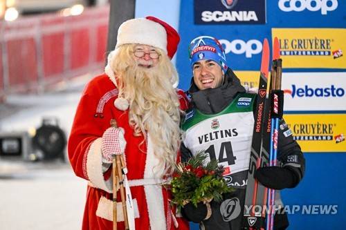 epa10332315 Federico Pellegrino (R) of Italy celebrates on the podium with Santa Claus (L) after taking the third place at the Men 20 km Pursuit Free race at the FIS Cross Country World Cup in Ruka, Finland, 27 November 2022. EPA/KIMMO BRANDT