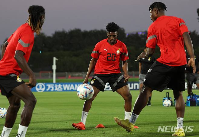 [도하(카타르)=뉴시스] 백동현 기자 = 모하메드 쿠두스를 비롯한 가나 축구대표팀 선수들이 27일(현지시간) 카타르 도하 어스파이어존 트레이닝센터에서 훈련하고 있다. 2022.11.27. livertrent@newsis.com