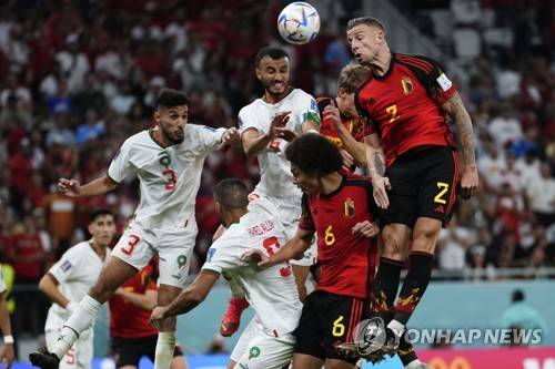 Belgium's Toby Alderweireld (2) and Morocco's Romain Saiss go for a header during a World Cup group F soccer match at the Al Thumama Stadium in Doha, Qatar, Sunday, Nov. 27, 2022. (AP Photo/Manu Fernandez)