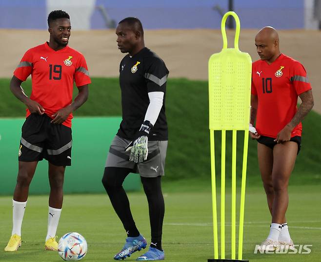 [도하(카타르)=뉴시스] 백동현 기자 = 이냐키 윌리엄스(왼쪽)와 안드레 아예우가 27일(현지시간) 카타르 도하 어스파이어존에 마련된 가나 축구대표팀 트레이닝센터에서 훈련하고 있다. 2022.11.27. livertrent@newsis.com