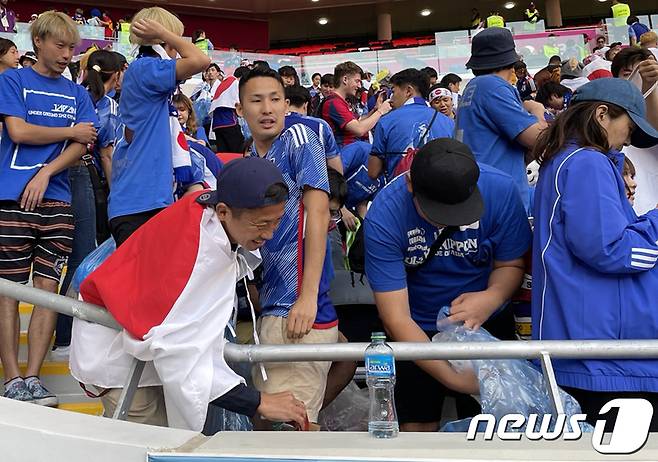 (도하(카타르)=뉴스1) 이광호 기자 = 27일 오후(현지시간) 카타르 알라이얀 아흐메드 빈 알리 스타디움에서 2022 카타르 월드컵 조별리그 E조 2차전 일본과 코스타리카의 경기가 끝난뒤 일본 응원단이 쓰레기를 정리하고 있다. 2022.11.27/뉴스1