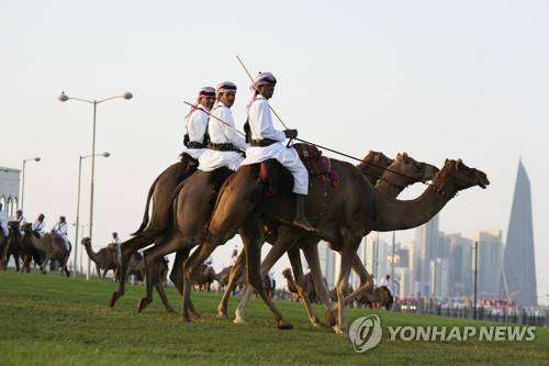 Guards ride their camels outside the Amiri Diwan in Doha, Sunday, Nov. 27, 2022. (AP Photo/Jorge Saenz)
