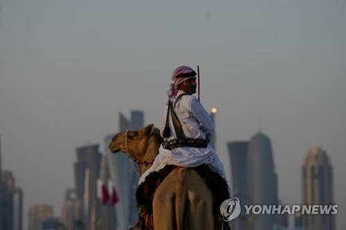 A guard rides his camels outside the Amiri Diwan in Doha, Sunday, Nov. 27, 2022. (AP Photo/Natacha Pisarenko)