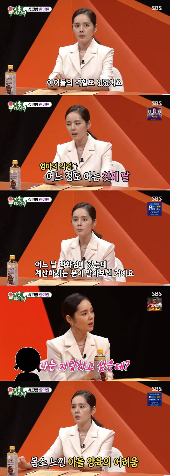 둘째 아들은 엄마의 직업을 모르지만 첫째는 어렴풋이 알고 있다고. 한가인은 "첫째는 정확히는 모르지만 엄마가 TV에 나오는 사람이라는 정도는 안다"며 "어느날 백화점에 갔다. 모자도 쓰고 마스크도 썼는데 직원이 저를 알아보더라. '어떻게 아셨냐' 하니까 따님이 말했다더라. 이 음료수 엄마가 모델이라고 했다더라. 자랑하고 싶어서 말한 거라 하더라. '엄마 예쁘니까 모델한 거잖아' (라더라)"라고 밝혔다.