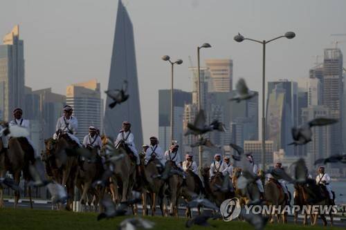 Guards ride their camels outside the Amiri Diwan in Doha, Sunday, Nov. 27, 2022. (AP Photo/Natacha Pisarenko)