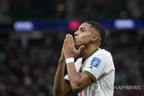 Morocco's Abdelhamid Sabiri celebrates after scoring his side's opening goal during the World Cup group F soccer match between Belgium and Morocco, at the Al Thumama Stadium in Doha, Qatar, Sunday, Nov. 27, 2022. (AP Photo/Christophe Ena)
