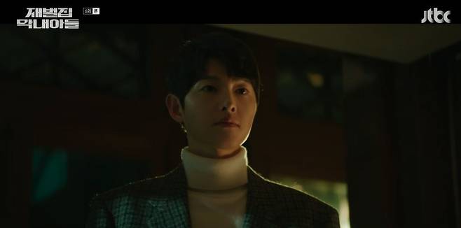 27일 방송된 JTBC '재벌집 막내아들'에선 미라클의 주인으로 양철(이성민 분) 앞에 서는 도준(송중기 분)의 모습이 그려졌다.