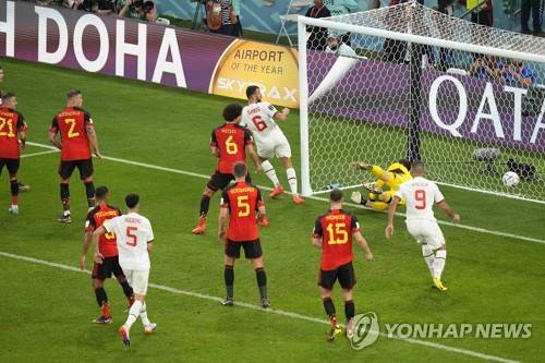 Morocco's Abdelhamid Sabiri, not in the frame, scores his side's first goal during the World Cup group F soccer match between Belgium and Morocco, at the Al Thumama Stadium in Doha, Qatar, Sunday, Nov. 27, 2022. (AP Photo/Pavel Golovkin)